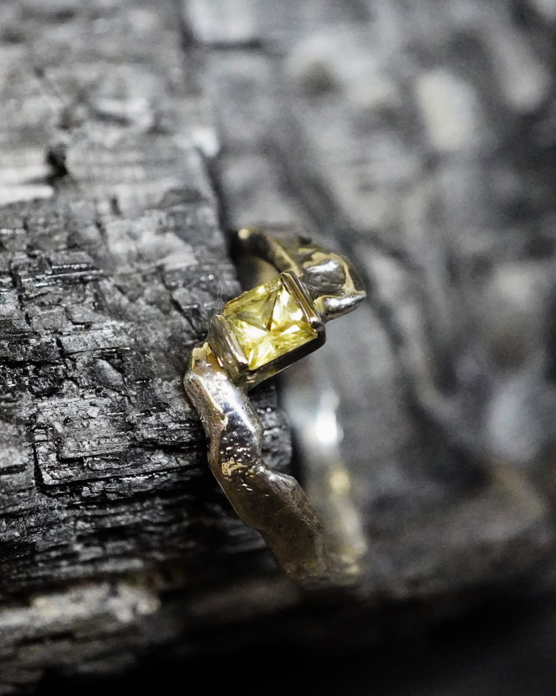 - Solitaire serti d'un saphir jaune carré de 0.23 carats, en provenance du Sri Lanka, conçu en argentium 940 recyclé. L'argentium, pur à 94%, ternit 7x moins vite que l'argent classique, possède une couleur plus blanche, et est hypoallergénique. C'est un argent de plus haute qualité que le 925 millièmes.